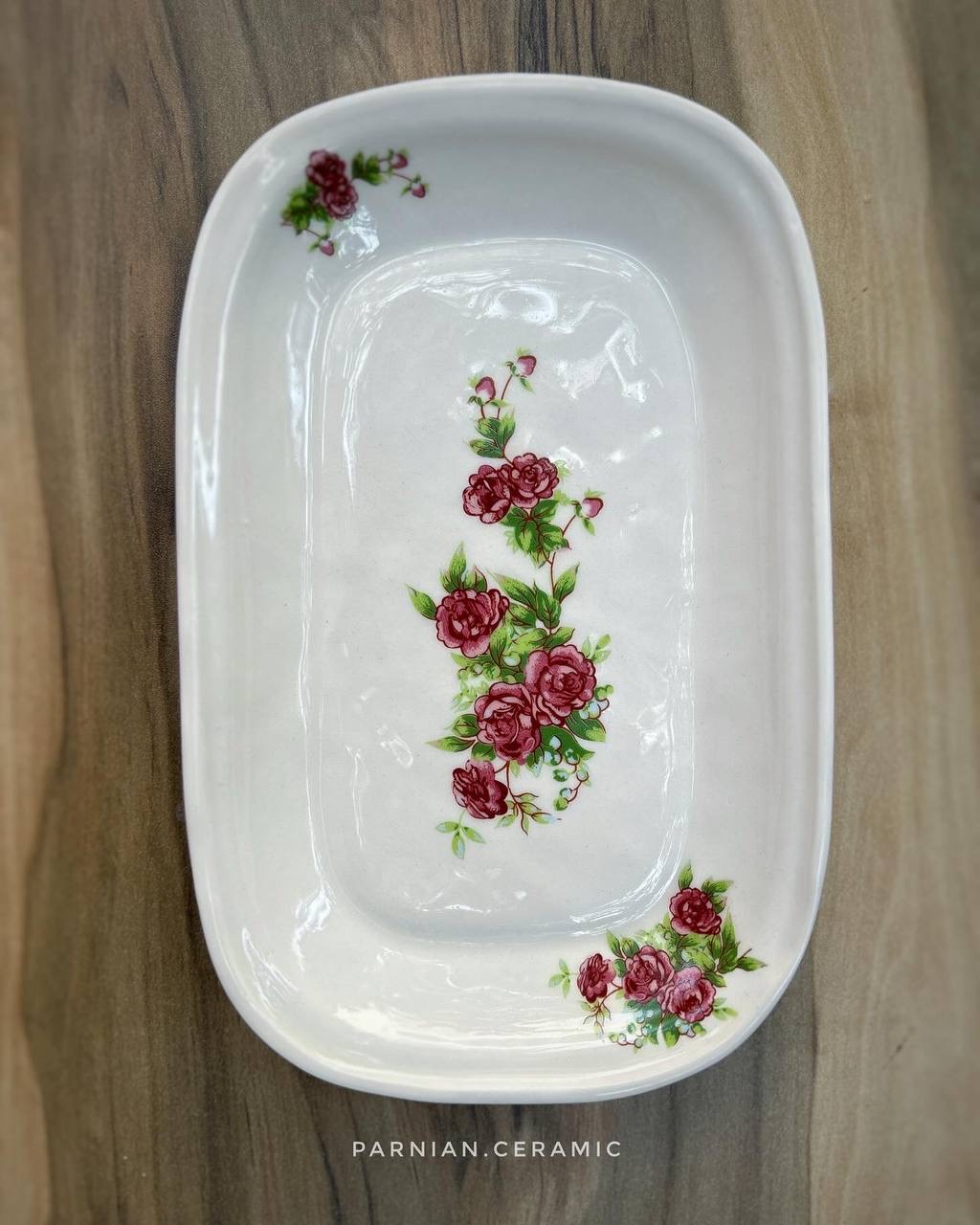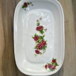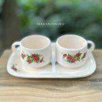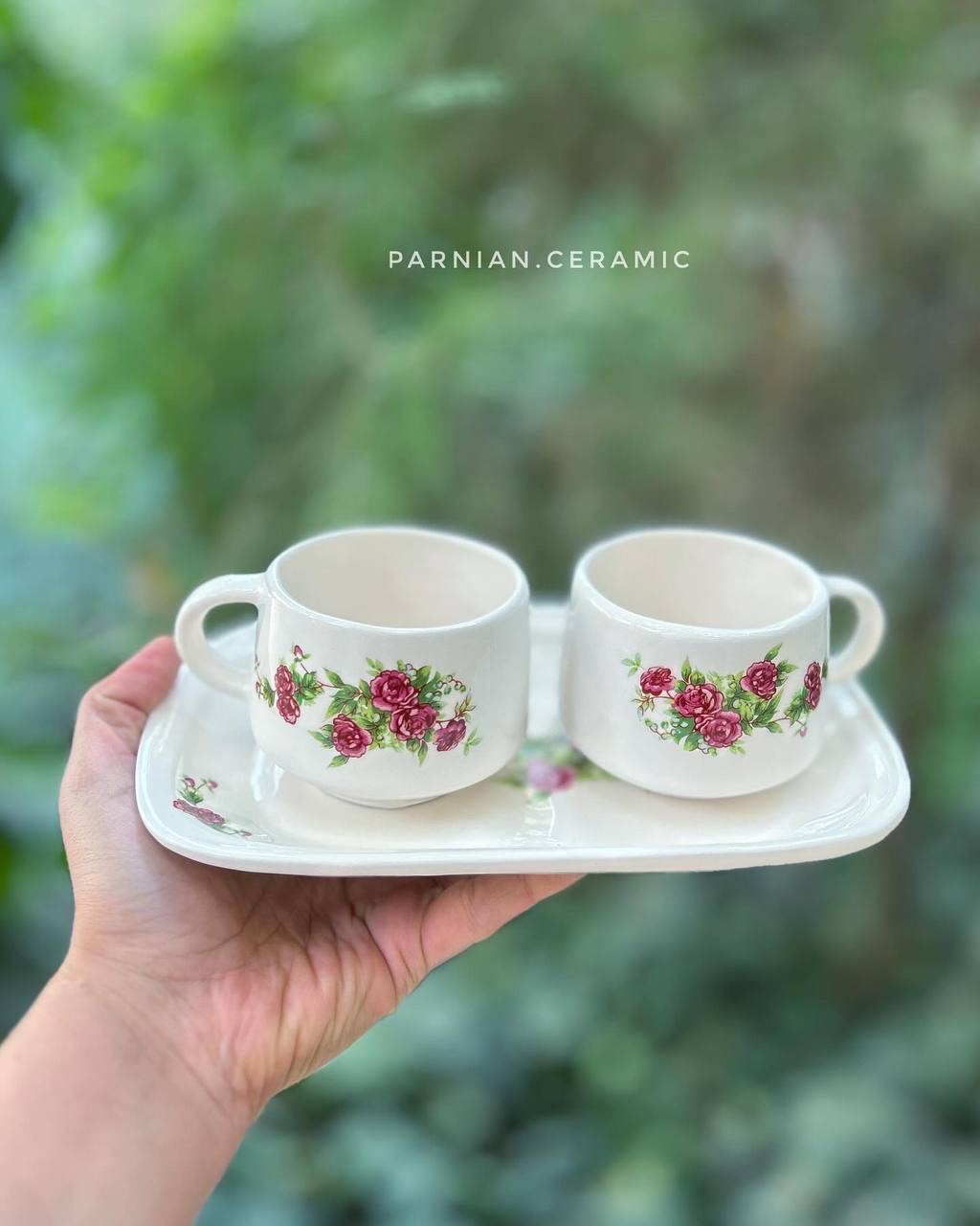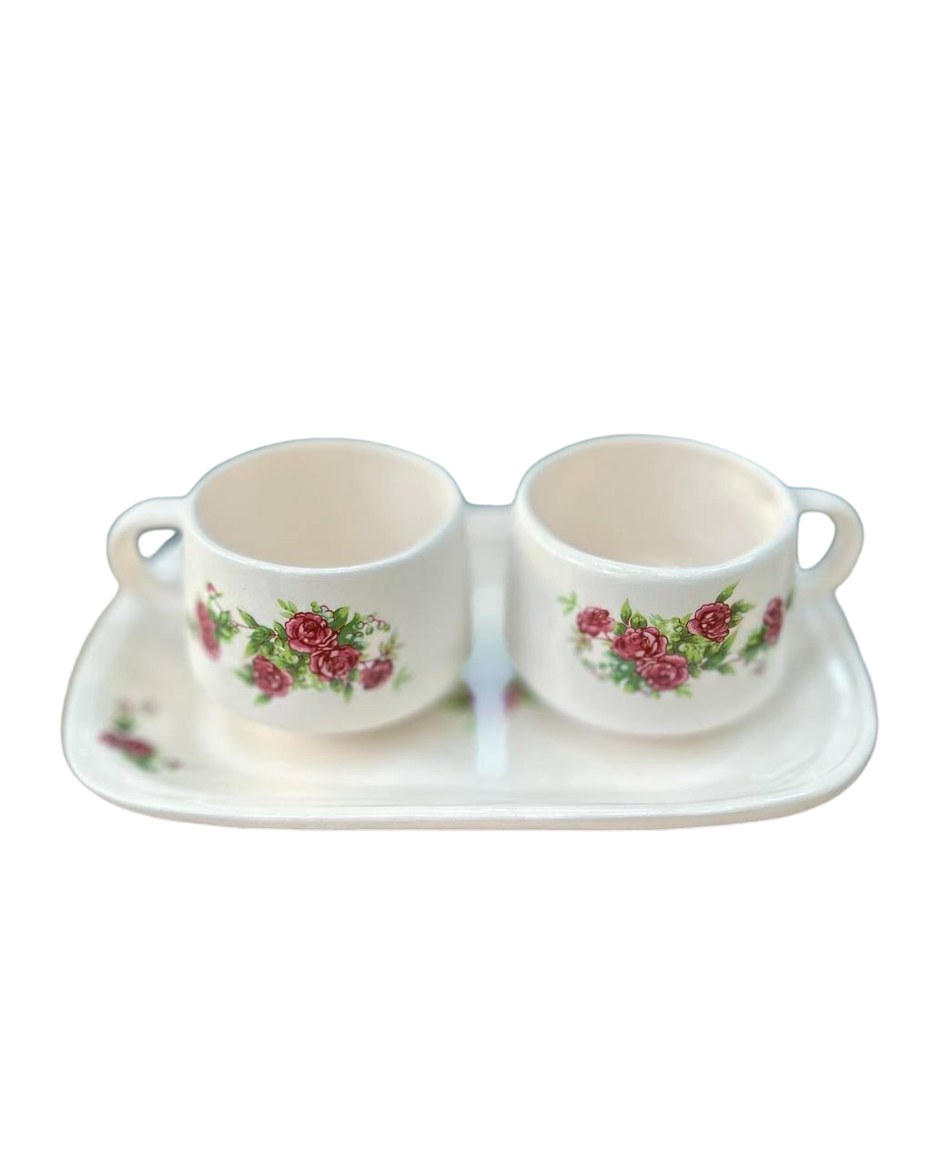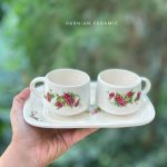 ست دونفره با طرح گلسرخی شامل دو فنجان و یک سینی مستطیل سرامیکی ساخته شده با دست و بهترین متریال است .