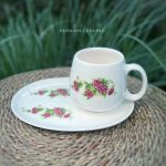 ماگ و سینی بیضی سرامیکی با طرح گل سرخی